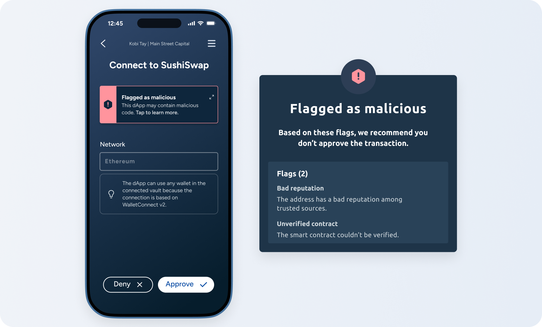 Eliminate the single point of key compromise of browser and hardware wallets. MPC and hardware security ensure key material is never centralized and resistant to unauthorized access. While integrated DeFi threat detection prevents interaction with malicious dApps and provides clarity into the impact of a contract call before signing.
