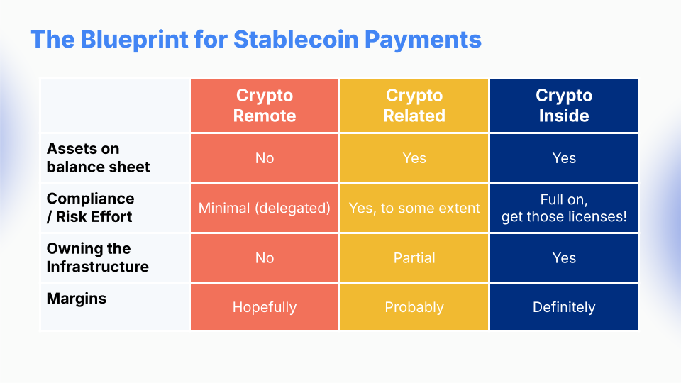 Every payments provider starts somewhere on the stablecoin adoption journey. Some of you enter the market as Crypto-Remote, working through partners to provide basic stablecoin capabilities while keeping digital assets off the balance sheet. But our experience tells us that you will evolve your approach in order to:
