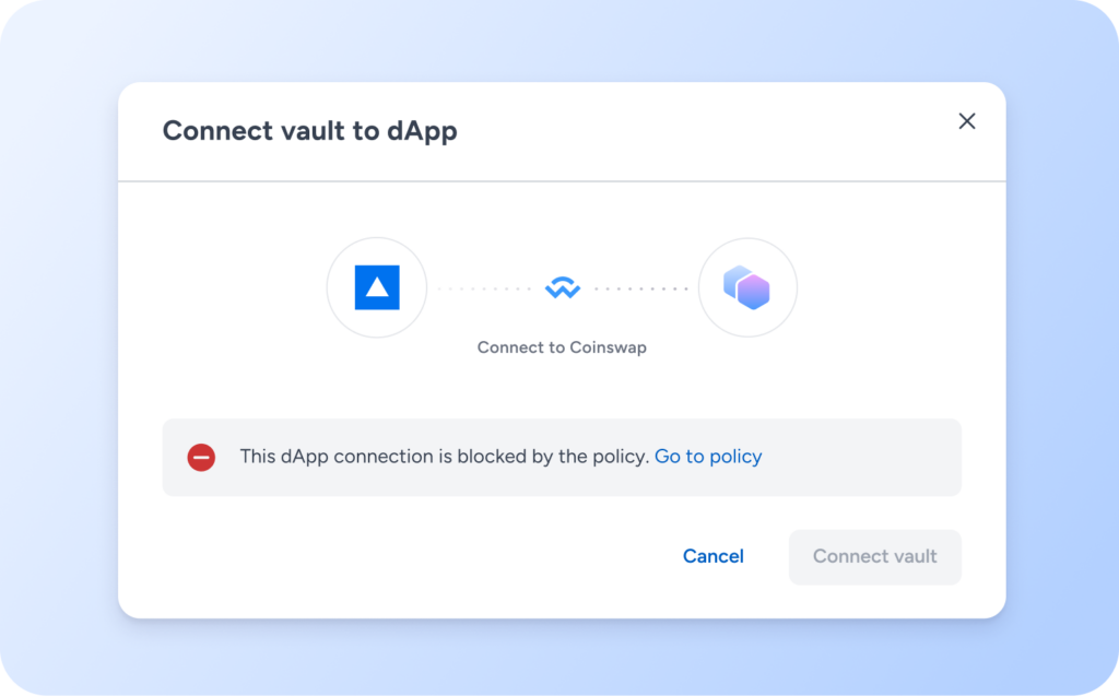Threat actors often create malicious dApp websites with names very similar to legitimate websites. With dApp Access Policy, Fireblocks becomes the first platform to give you control at the application layer—letting you whitelist trusted dApp URLs and enforce policy rules that limit exposure to unknown or risky destinations.