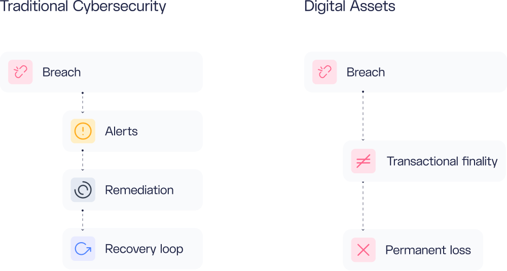 In digital assets, attackers need to succeed only once. When a malicious transaction reaches finality on the blockchain, there’s rarely a way to recover funds.