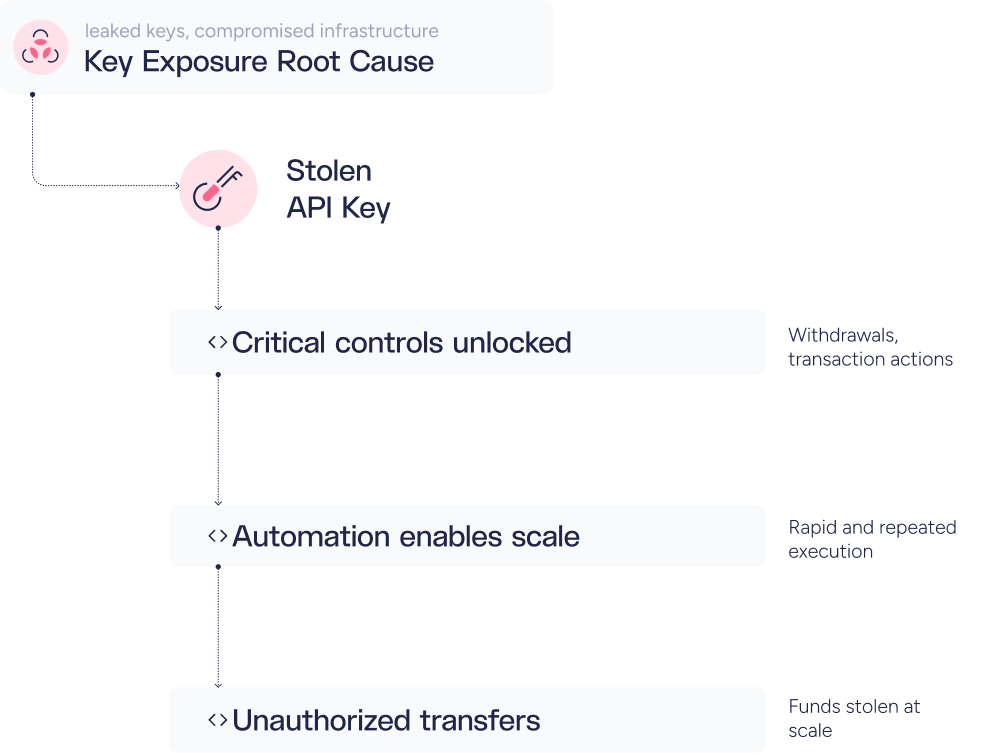 API compromise, particularly through stolen API keys, has become one of the most common attack vectors against cryptocurrency platforms. Attackers compromise developer machines, internal systems, or legitimate users to steal API credentials that control critical functions such as withdrawals, transaction signing, or account management. With these stolen keys, attackers can take over transaction management systems, identify vulnerabilities in authorization logic, and execute unauthorized fund transfers at scale, often bypassing user-facing security controls entirely. The automated nature of API access enables rapid, large-scale theft once credentials are obtained.