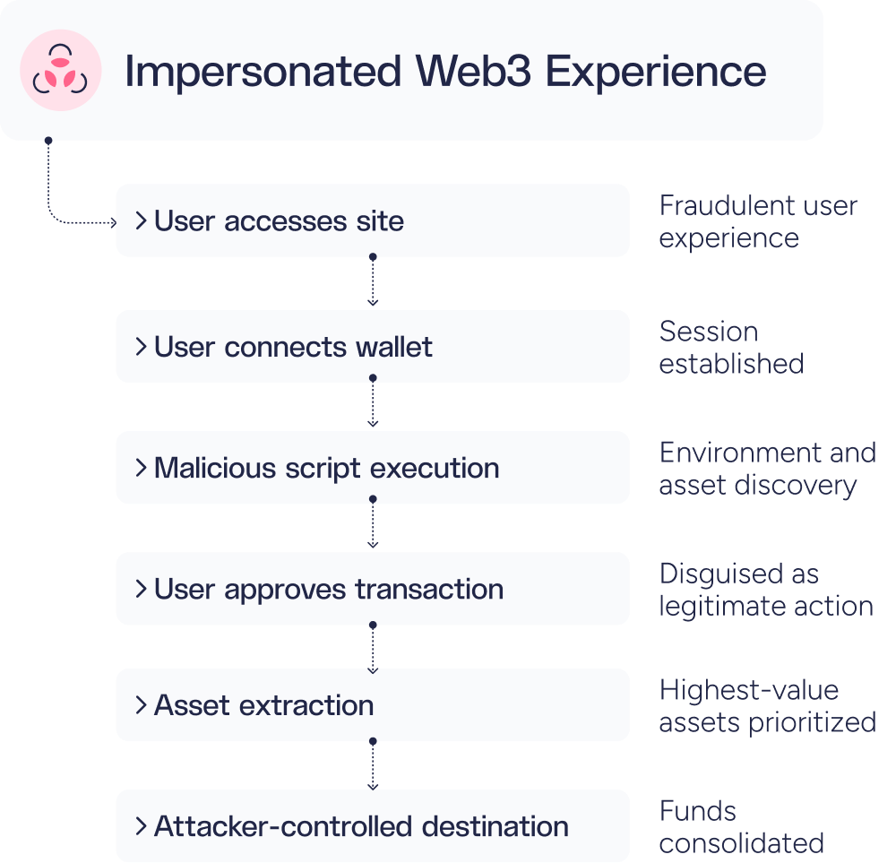 Wallet drainers are malicious scripts designed to siphon assets from cryptocurrency wallets by tricking users into authorizing fraudulent transactions. Attackers deploy phishing sites that impersonate legitimate web3 services, token airdrops, or NFT mints, prompting victims to connect their wallets and sign malicious transactions. Drainer scripts automatically identify and steal the wallet’s most valuable assets. The proliferation of DaaS platforms has made these attacks accessible to low-skilled operators, establishing wallet drainers as one of the most pervasive and dangerous threat vectors in DeFi.