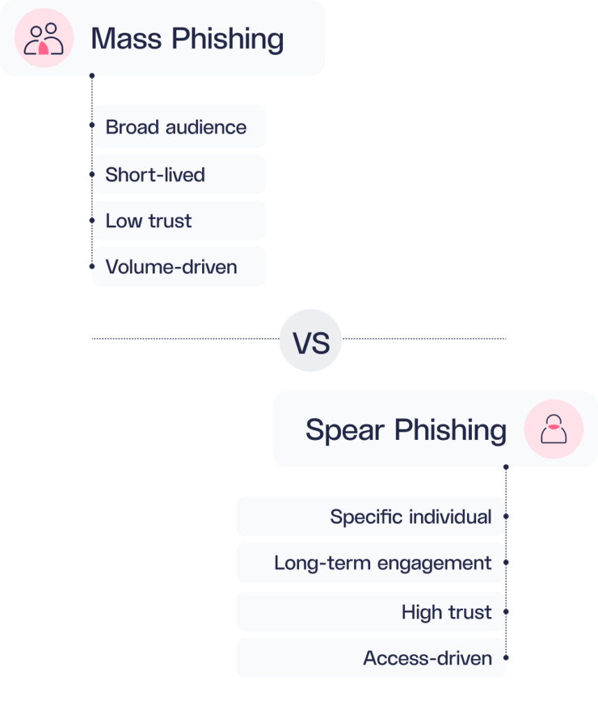 Unlike broad phishing campaigns, spear phishing involves highly targeted attacks against specific individuals with privileged access. Attackers conduct extensive reconnaissance to craft personalized lures, such as fake job offers, investment opportunities, or partnership proposals tailored to the target’s role and interests. These campaigns often involve prolonged engagement through LinkedIn, email, phone calls, videoconference calls, or messaging platforms to build trust before delivering malware or extracting credentials. Contagious Interview exemplifies this approach, successfully compromising employees at defense contractors and cryptocurrency firms through fabricated recruitment processes.